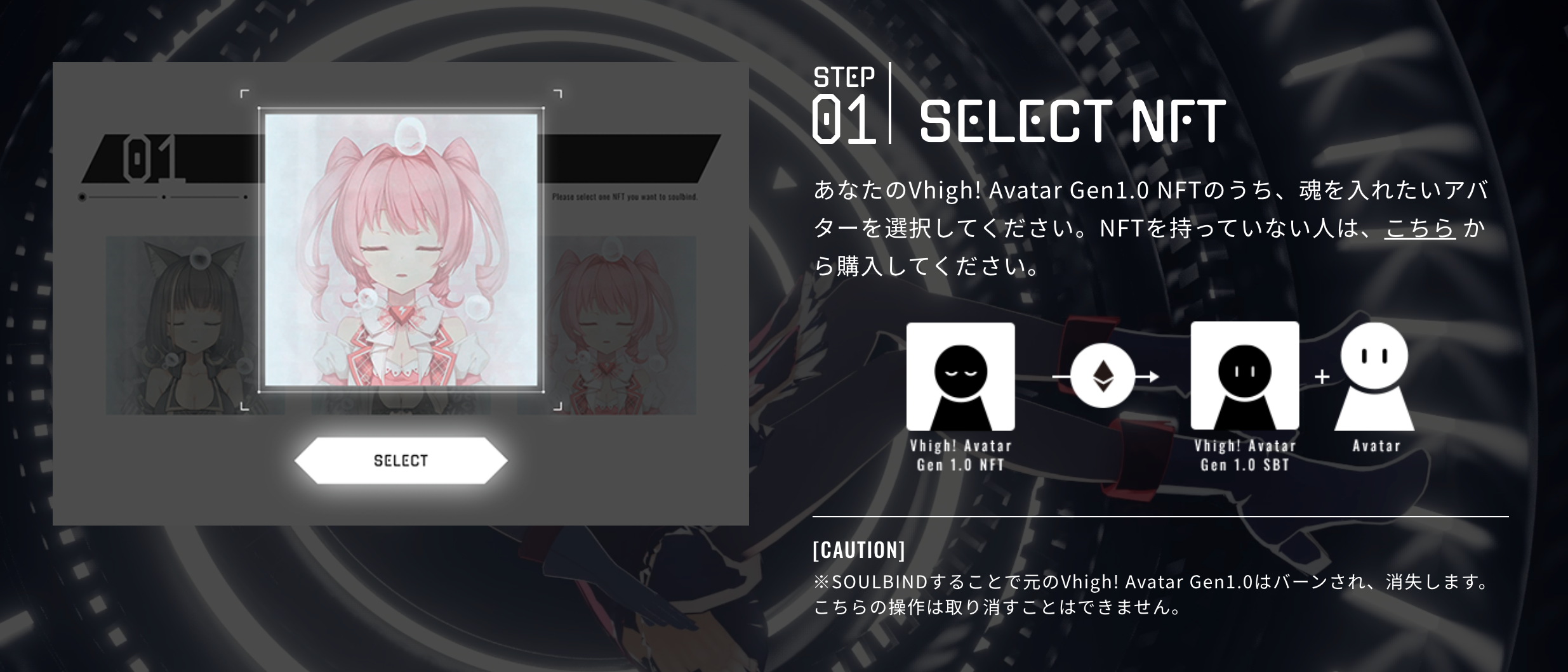 自分のAvatarにしたいVhigh! Gen1.0 NFTを購入し、SOULBIND(SBT化)することで自分だけの自分だけのVhigh! Avatarを入手することができます。SOULBINDにはVhigh! Gen1.0 NFTと0.1ETHが必要です。