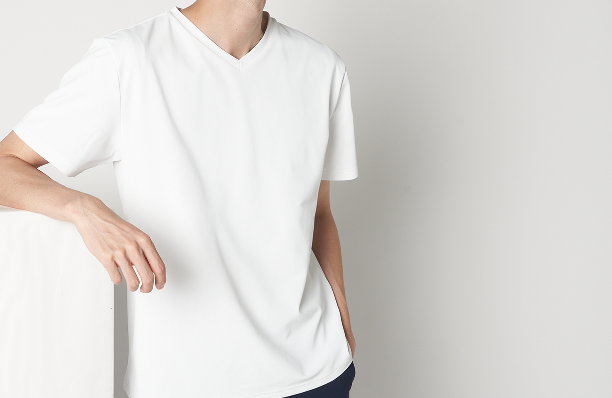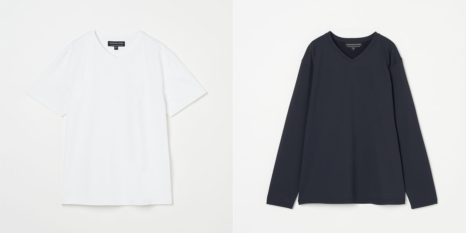 加えて「MOON-TECH®」素材の特徴を活かし、襟部分を通常のリブ組織ではなく身生地同一とし、かつ通常の襟パーツ幅より大幅に細くすることで、Vネックの特徴である「シャープですっきり見える」点を強調することに成功しています。