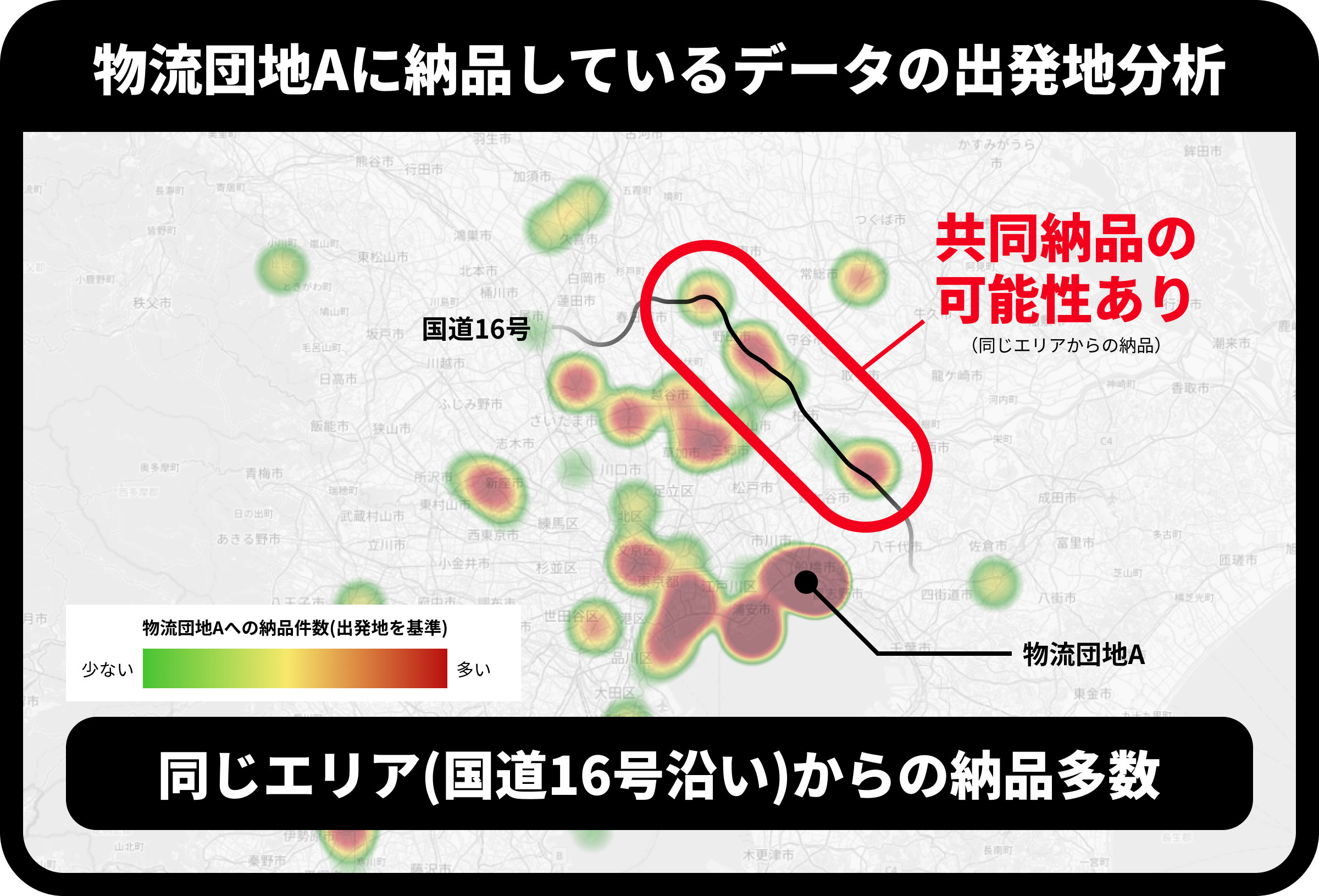 抽出したデータを分析した結果、ある1日において、国道16号沿いを出発地として、小型トラックで類似品目を同時刻に納品している実績があることが分かりました。このことから、事業者を超えた共同納品を実現できる可能性があることが明らかになりました。