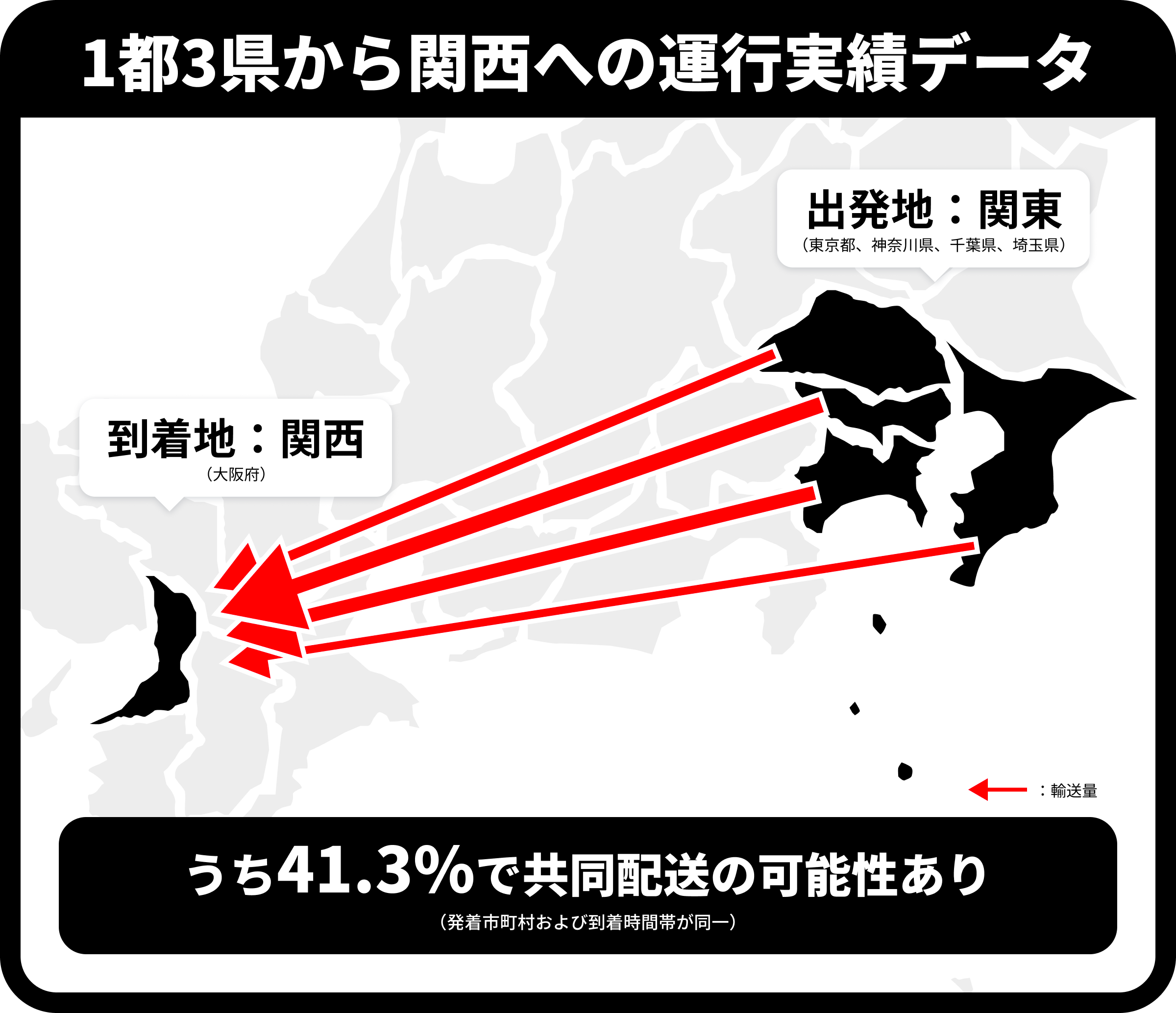 1都3県(東京都、神奈川県、千葉県、埼玉県)から関西(大阪府)への長距離輸送を対象に、共同配送の実現可能性を検証しました。