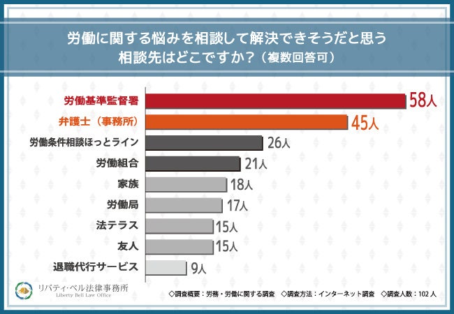 もっとも多かった回答は『労働基準監督署』でした。次に多かった回答が『弁護士(事務所)』です