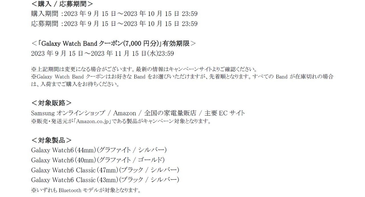 対象期間中に対象販路にて、「Galaxy Watch6シリーズ」をご購入・ご応募いただいたお客様全員に、Samsungオンラインショップ( https://www.samsung.com/jp/offer/ )でご使用いただける「Galaxy Watch Bandクーポン(7,000円分)」をプレゼントいたします。