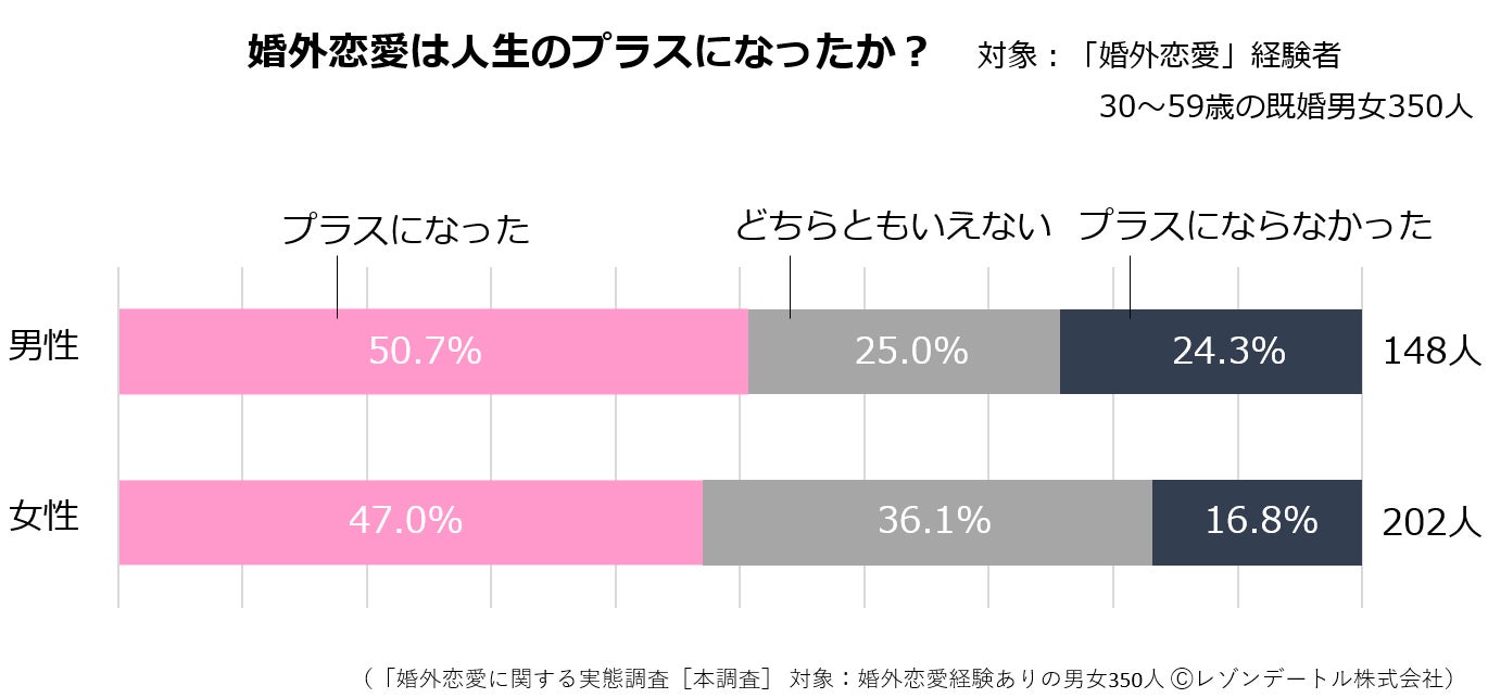 経験者たちは「婚外恋愛」をどのようにとらえているのでしょうか。ポジティブな経験ととらえているか、ネガティブととらえているか。実際に交際した相手との関係も大きく影響するでしょう。まず、婚外恋愛の経験が「自分の人生にプラスとなったか」を尋ねました。