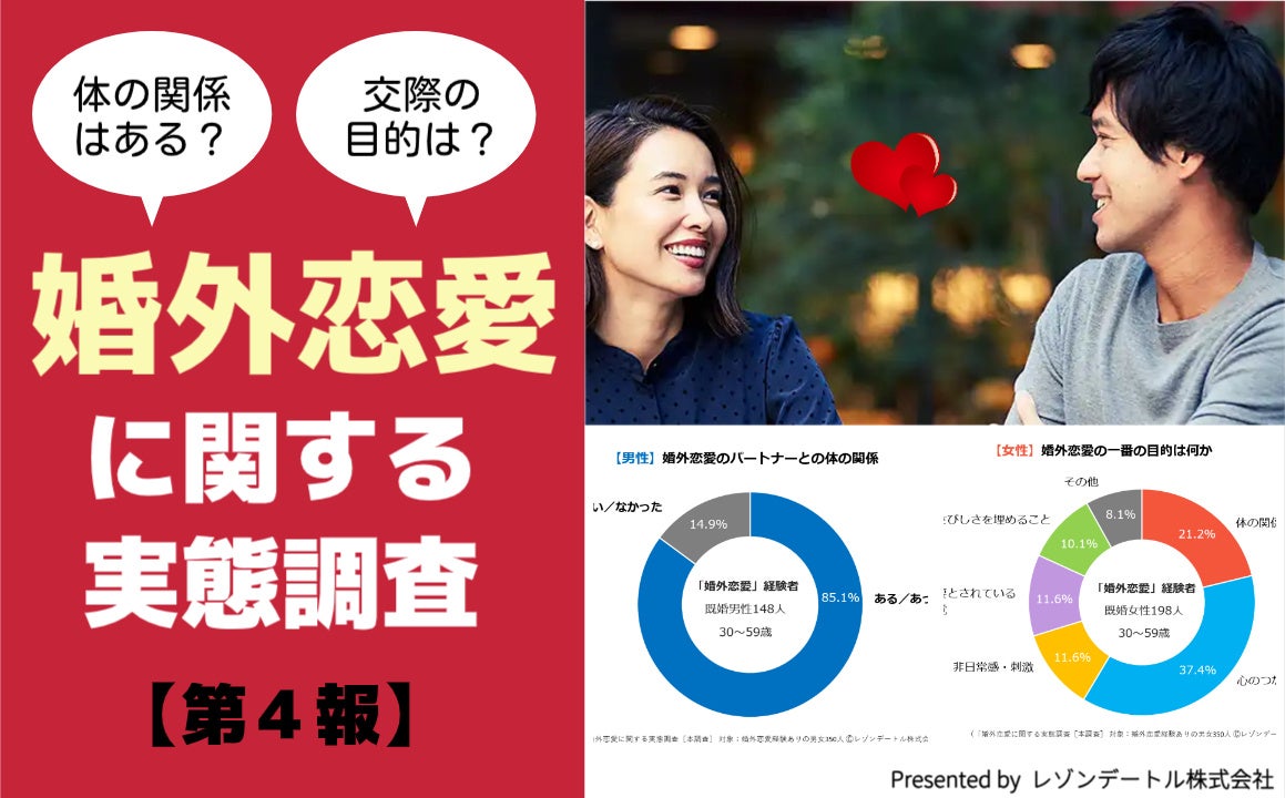 今回の第4報では「婚外恋愛経験者」の既婚男女350人に「体の関係の有無」「婚外恋愛の目的」「妻・夫への罪悪感の有無」「婚外恋愛は人生のプラスになったか」「今後も婚外恋愛をしたいと思うか」などを尋ねた結果を分析します。