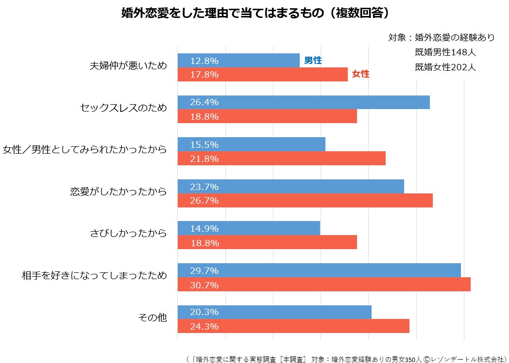 男女とも最も多い回答は「相手を好きになってしまったため」(男性29.7%、女性30.7%)でした。男女とも3割は「好き」が高じて婚外恋愛に移行したことになりますが、逆に言えば7割が「そうではない」ということになります。