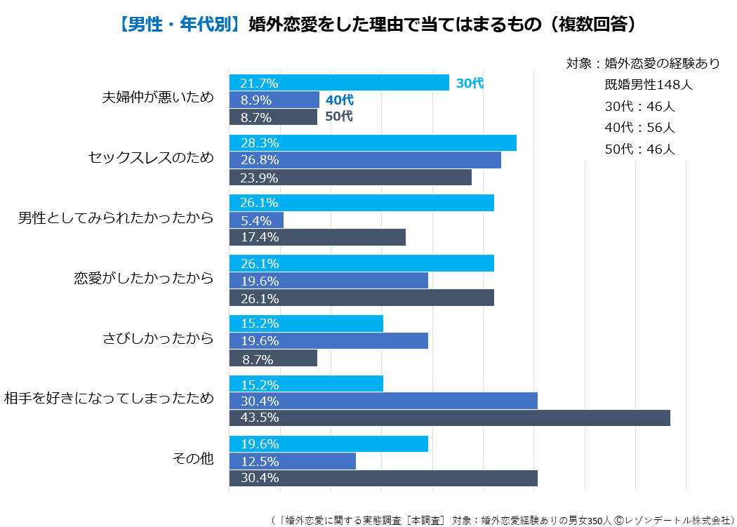男女とも最も多い回答は「相手を好きになってしまったため」(男性29.7%、女性30.7%)でした。男女とも3割は「好き」が高じて婚外恋愛に移行したことになりますが、逆に言えば7割が「そうではない」ということになります。