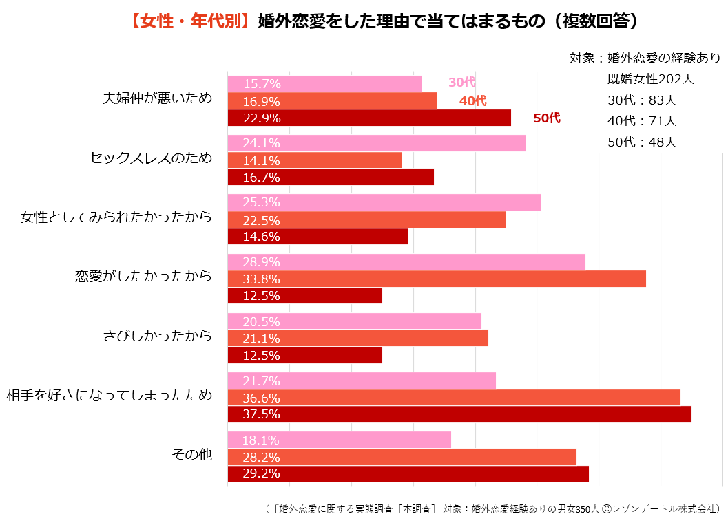 今度は複数回答で「婚外恋愛をした理由」を尋ねてみたところ、次の結果になりました。