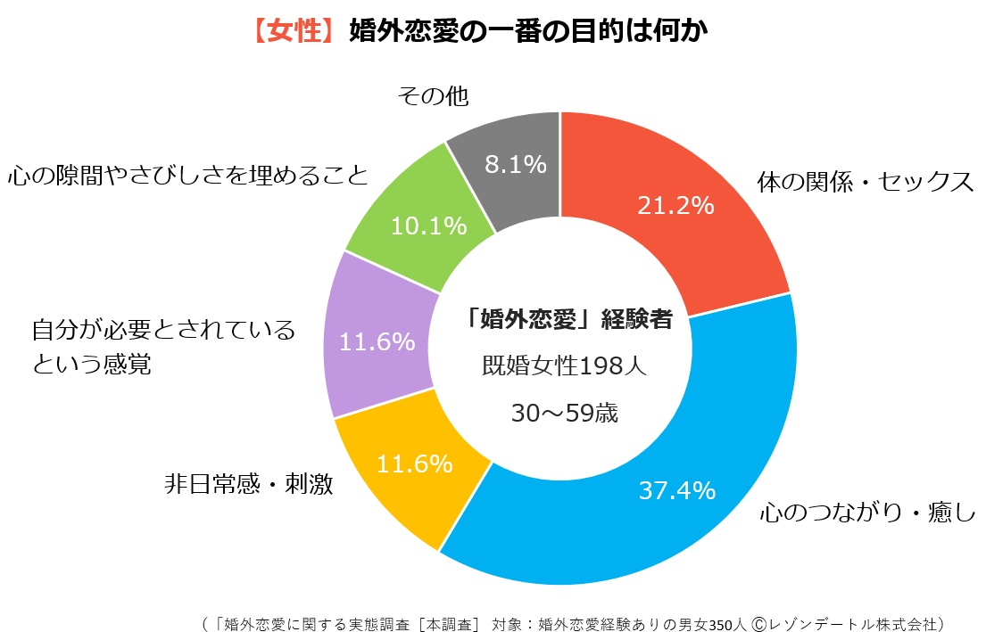 そもそも既婚者が婚外恋愛に踏み出す目的は何でしょうか。「調査対象者について」で説明したように上の「体の関係の有無」とは若干違うサンプルを対象にした調査ですが、次の結果が示されました。なお、複数選択ではなく、あえて「一番の目的」を尋ねています。