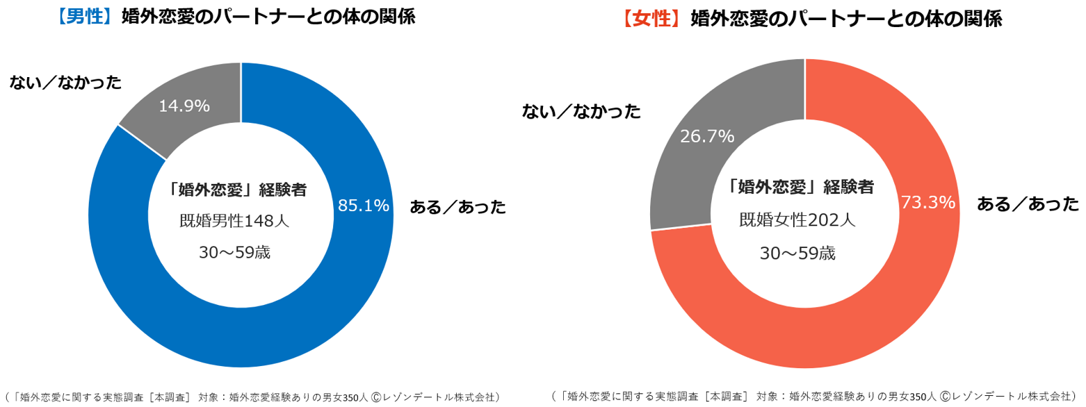今回の第4報では「婚外恋愛経験者」の既婚男女350人に「体の関係の有無」「婚外恋愛の目的」「妻・夫への罪悪感の有無」「婚外恋愛は人生のプラスになったか」「今後も婚外恋愛をしたいと思うか」などを尋ねた結果を分析します。