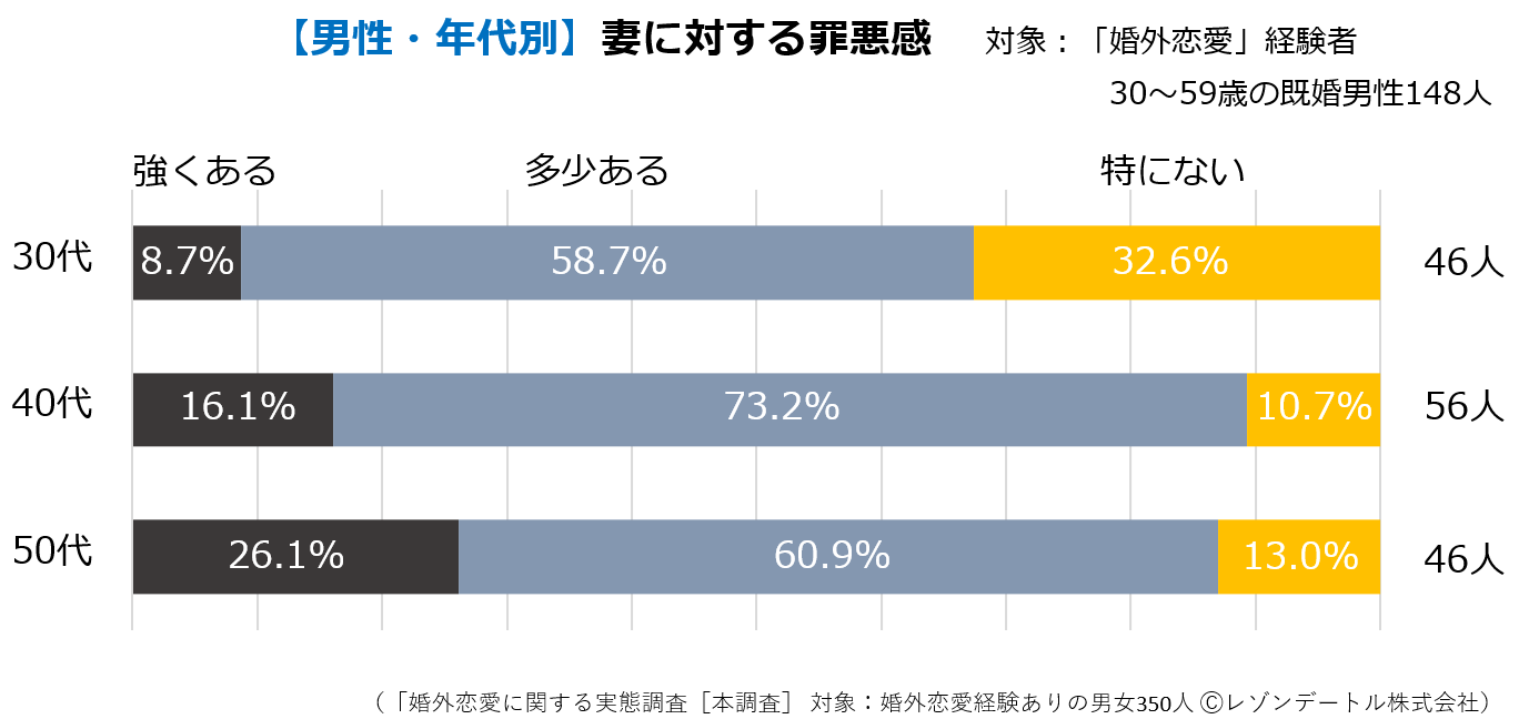 男性では30代の「夫婦仲が悪いため」(21.7%)が突出していることが注目されます。そして、50代の「相手を好きになってしまったため」(43.4%)も注目でしょう。後ほど紹介する「妻への罪悪感」の結果と合わせて、50代男性は「ピュア」という印象をつくります。逆に30代男性は「相手を好きになってしまったため」が15.2%しかなく、婚外恋愛にある種の「逃避」の要素が含まれているのかもしません。