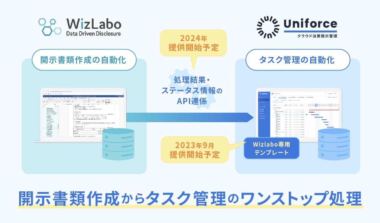 このWizLaboのメニュー体系をベースとしたテンプレートをUniforceの「クラウド決算開示管理」上で利用できるようにすることでWizLaboによる開示書類作成処理と同期されたタスク管理が可能となり、ワンストップな決算業務環境構築をご支援いたします。