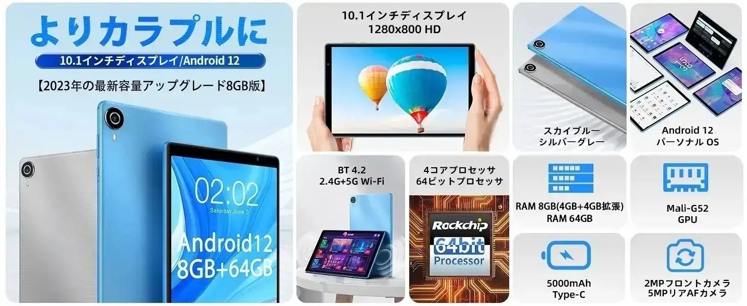 10インチ / Android 12 / 8GB(4+4GB拡張)RAM+64GB ROM+1TB拡張 / Wi-Fiモデル / 3.5mmヘッドフォンジャック / 児童守護