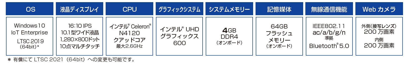 特定業務用途専用のOSであるWindows 10 IoT Enterprise LTSC 2019 (64bit)を搭載。勤怠管理やPOSレジ用などある用途専用に開発されたソフトウェアは、OSの機能更新の影響を受けずに長期使用ができるとともに、品質面では最新かつ最善の状態を保持して安定的に使い続けることが可能です。また、当OSに搭載された各種のロックダウン機能によるセキュリティ強化により、実使用環境下でも高い安全性が確保できます。