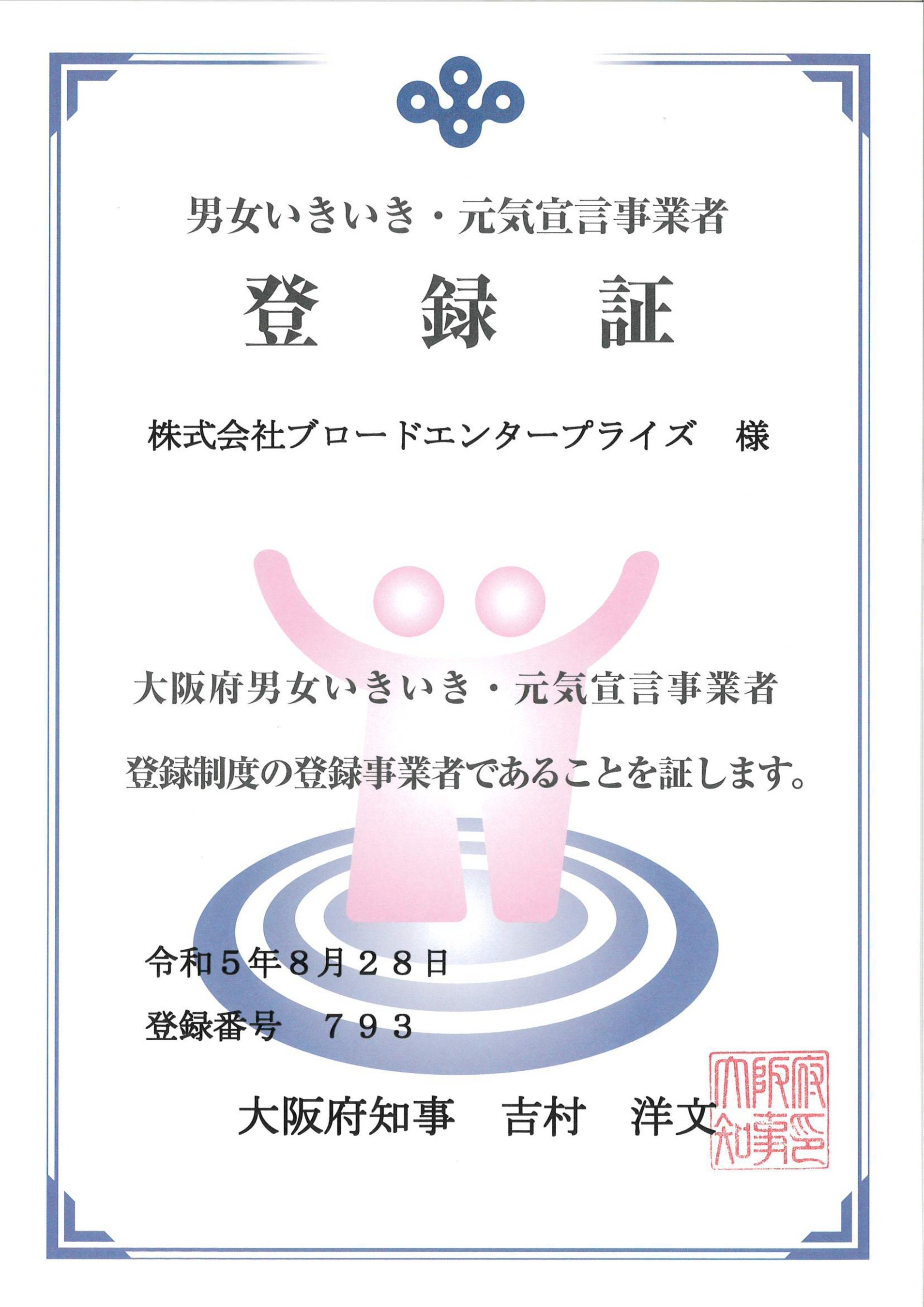 「女性の能力活用」や「仕事と家庭の両立支援」など、男性も女性もいきいきと働くことのできる取組みを進める意欲のある事業者を、「男女いきいき・元気宣言」事業者として登録し、その取組みを応援する大阪府の認定制度です。