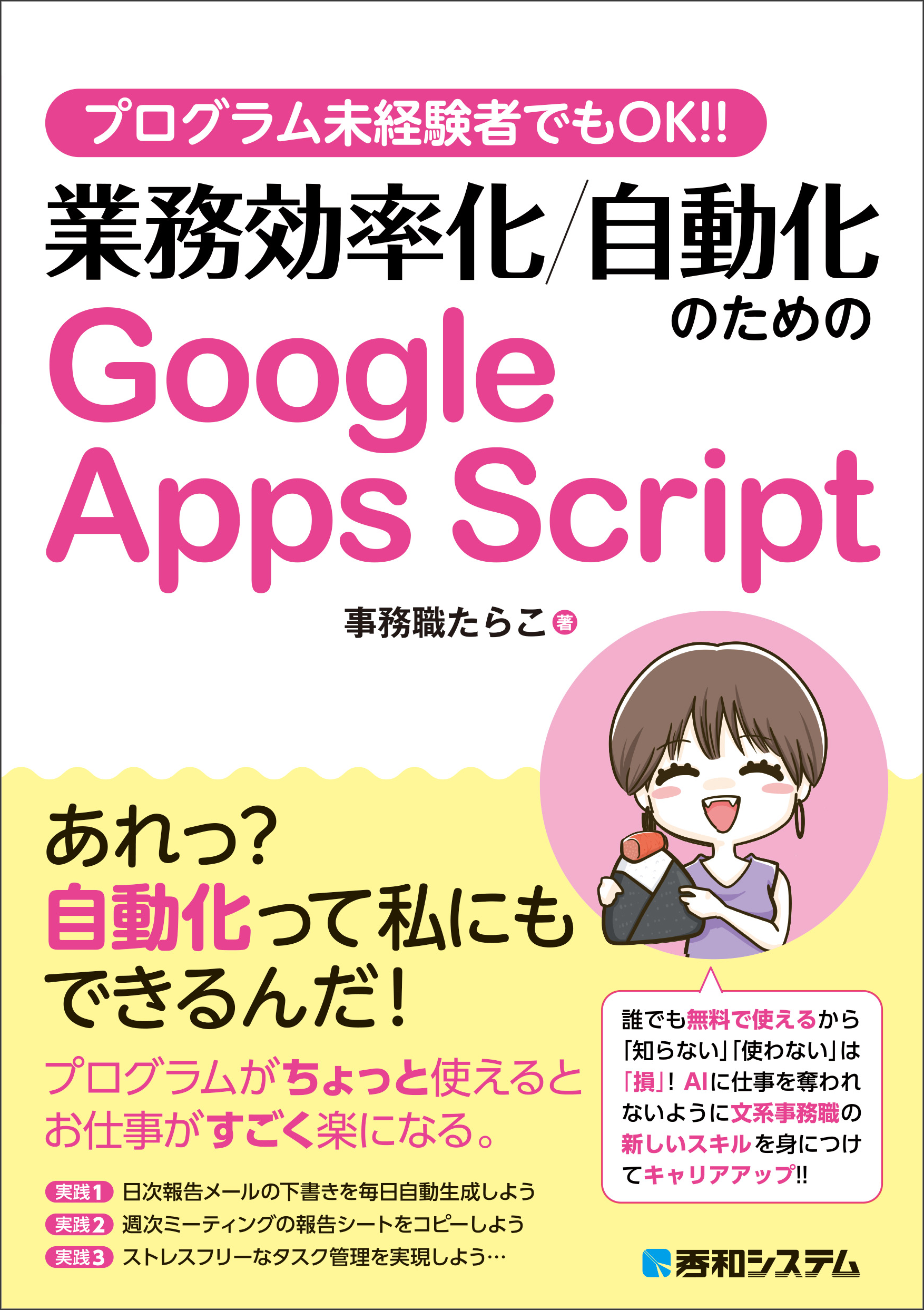 株式会社秀和システム(東京都・代表取締役会長兼社長 上田智一)は、2023年9月20日、新刊『プログラム未経験者でもOK!! 業務効率化/自動化のためのGoogle Apps Script』を発刊します。