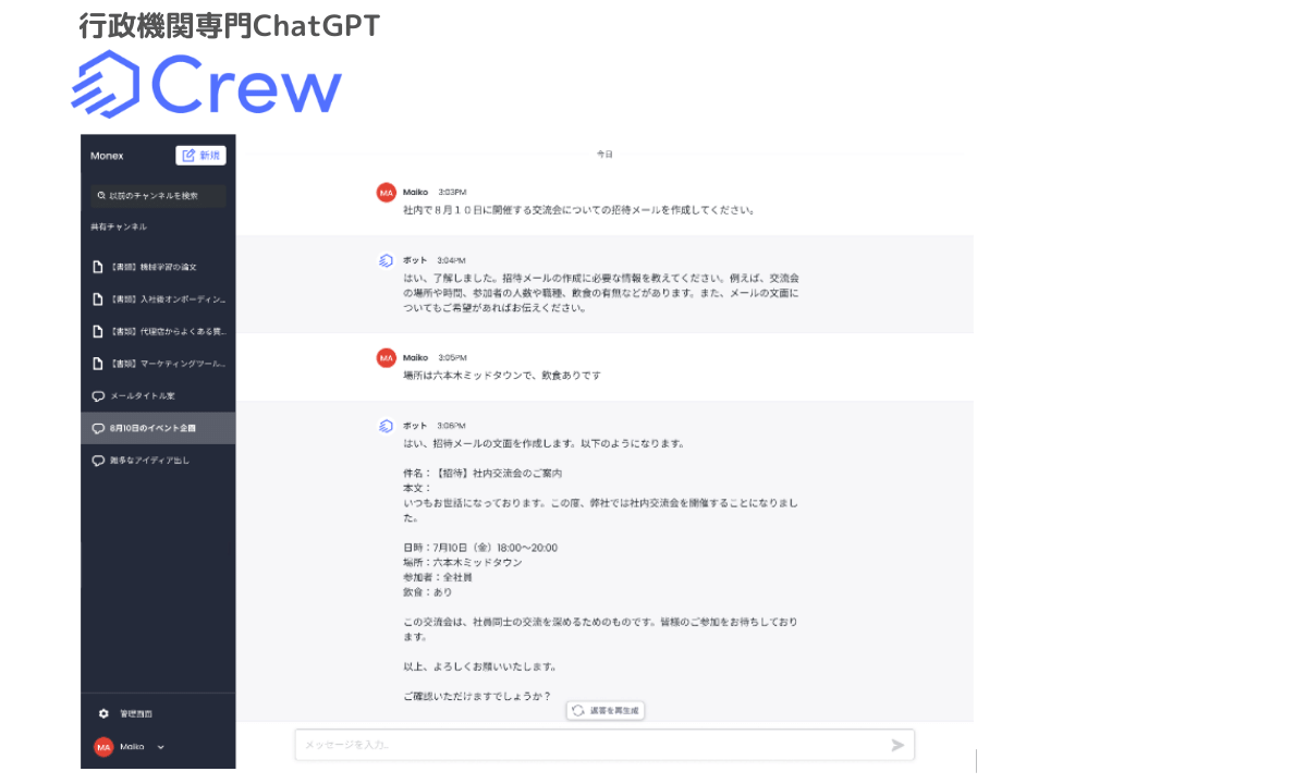 「Crew」は、企業・行政がChatGPTを手軽に安全に使えるサービスです。