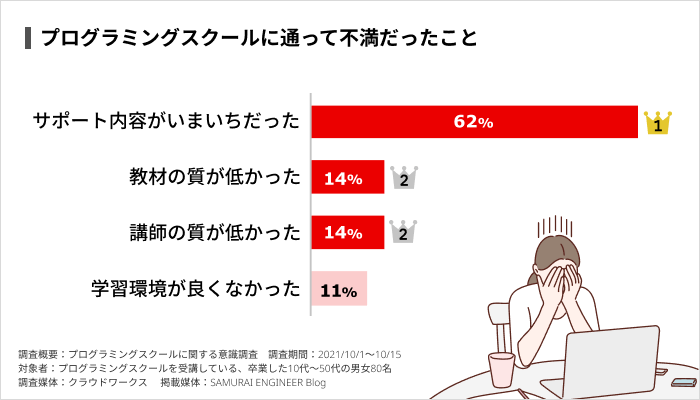 一方、「プログラミングスクールに通って不満だったこと」を聞いたところ、「サポート内容がいまいちだった」と回答した人が62%という結果となりました。また、「教材の質が低かった」「講師の質が低かった」と回答した人がそれぞれ14%、「学習環境がよくなかった」と回答した人が11%でした。