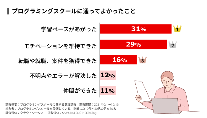 「プログラミングスクールに通ってよかったこと」を聞いたところ、1位は「学習ペースが上がった」で31%、僅差で「モチベーションを維持できた」が2位で29%、3位は16%で「転職や就職、案件を獲得できた」という結果でした。