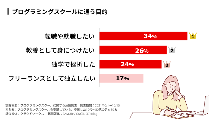 [1]「転職や就職をしたい」という目的でプログラミングスクールに通う人が34%