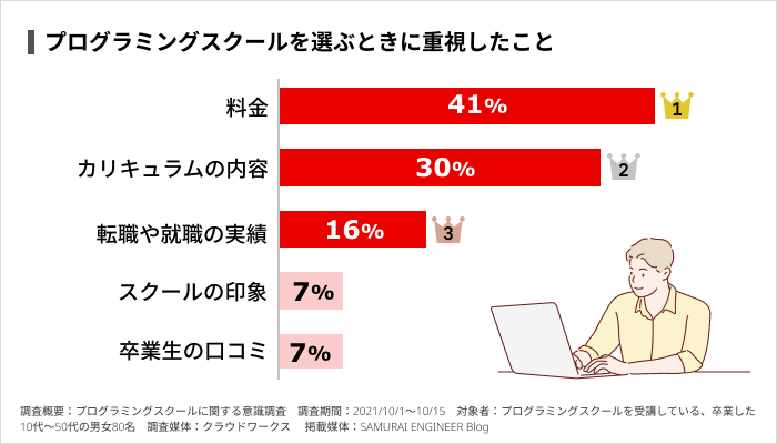 「プログラミングスクールを選ぶときに重視したこと」について聞いたところ、「料金」と回答した人が41%で1位、「カリキュラムの内容」と回答した人が30%で2位、次いで「転職や就職の実績」と回答した人が16%で3位という結果でした。