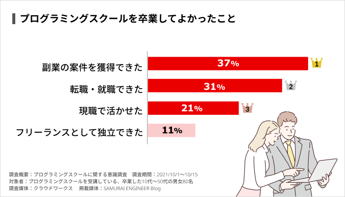 「プログラミングスクールを卒業してよかったこと」を聞いたところ、1位は「副業の案件を獲得できた」ことで37%でした。次いで、「転職・就職できた」が31%、「現職で活かせた」が21%、「フリーランスとして独立できた」が11%と続く結果となりました。