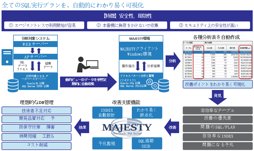 『MAJESTY』の新特許技術を用いて従来手法では実現できなかった新たなアプローチにより、コストと作業負担の抑制を共に同時に実現しつつ、データベースのマイグレーション後もシステムの品質や性能が維持され、問題が発生した場合にもOracle Databaseに習熟していないエンジニアでの対処が容易になりました。