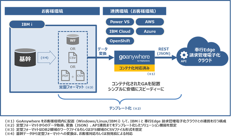 これらを解消するべく、OBCでは、ソルパックの『GoAnywhere』を用いて『奉行Edge請求管理電子化クラウド』と『IBM i』上の基幹システムを連携いたします。容易な設定で、『IBM i』ユーザーは簡単に『奉行Edge請求管理電子化クラウド』を活用でき、請求業務の自動化、ペーパーレス化にすぐに対応可能で、請求書のペーパーレス化を出発点に簡単にDXが始められます。