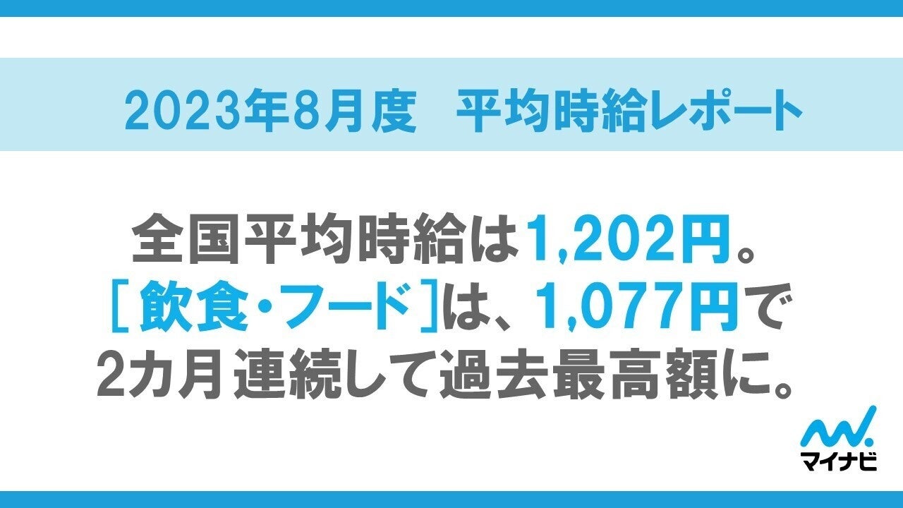 23年8月の全国平均時給は1,202円となり前年同月比は12カ月連続で増加。[飲食・フード]は1,077円で2カ月連続して過去最高額に【図1、2、3】