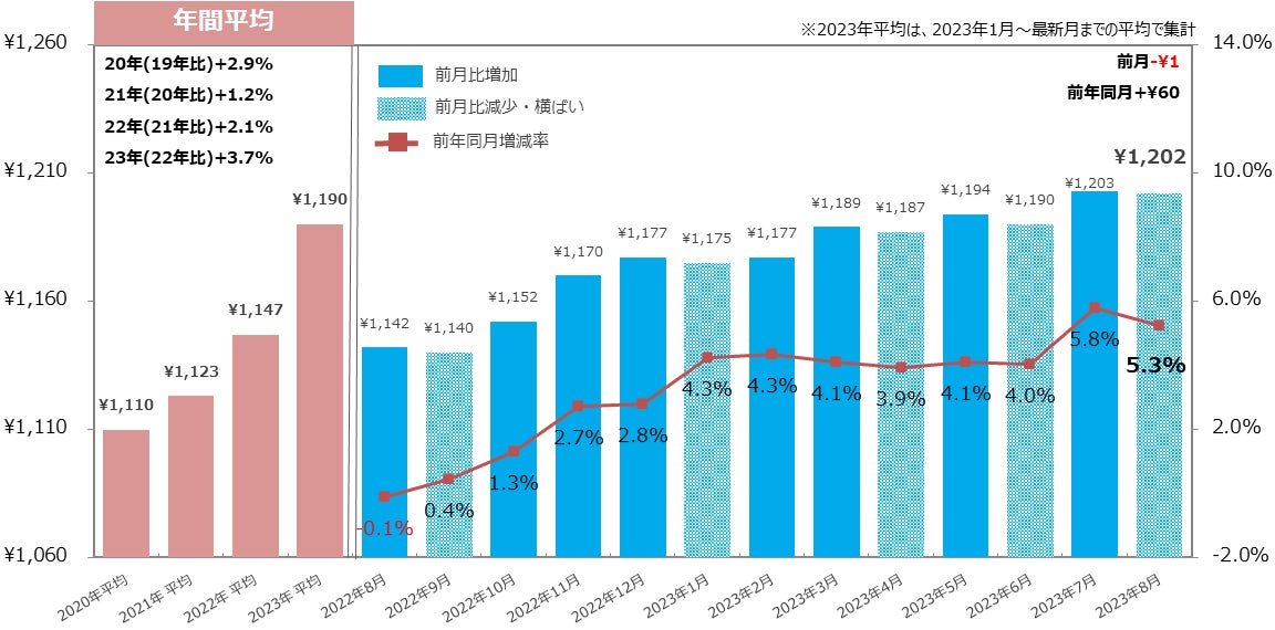 23年8月の全国平均時給は1,202円(前月比:-1円、前年同月比:+60円)となり、前年同月比は22年9月以降12カ月連続の増加となった。