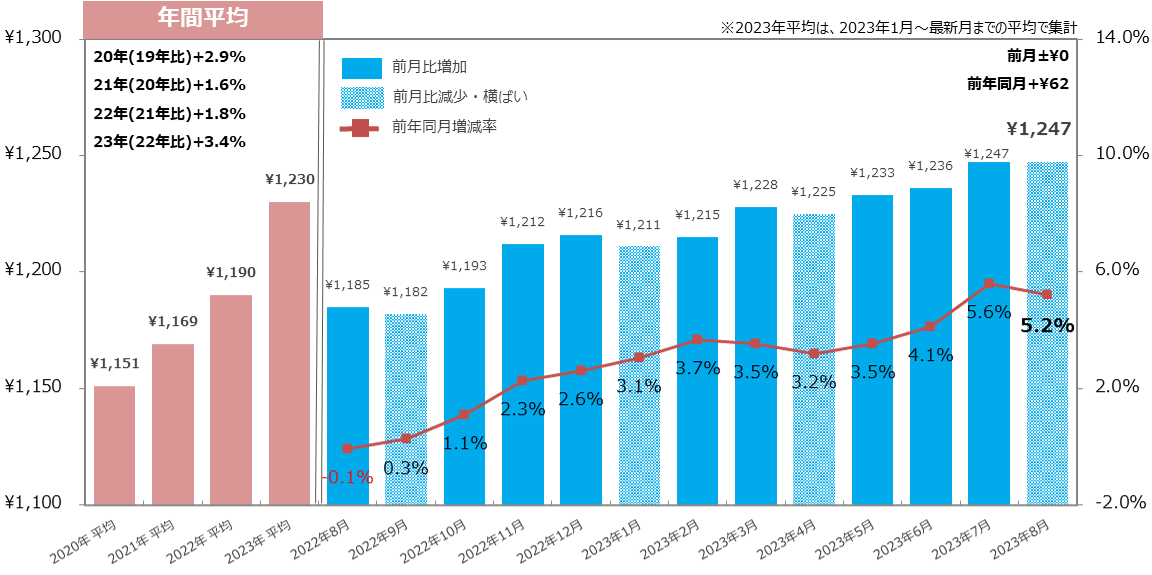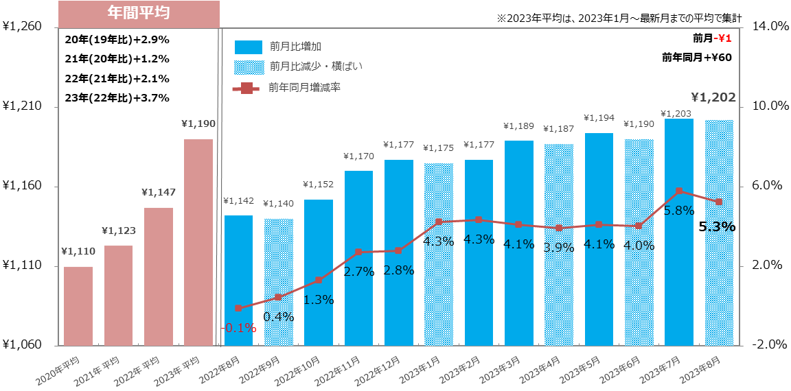 23年8月の全国平均時給は1,202円(前月比:-1円、前年同月比:+60円)となり、前年同月比は22年9月以降12カ月連続の増加となった。