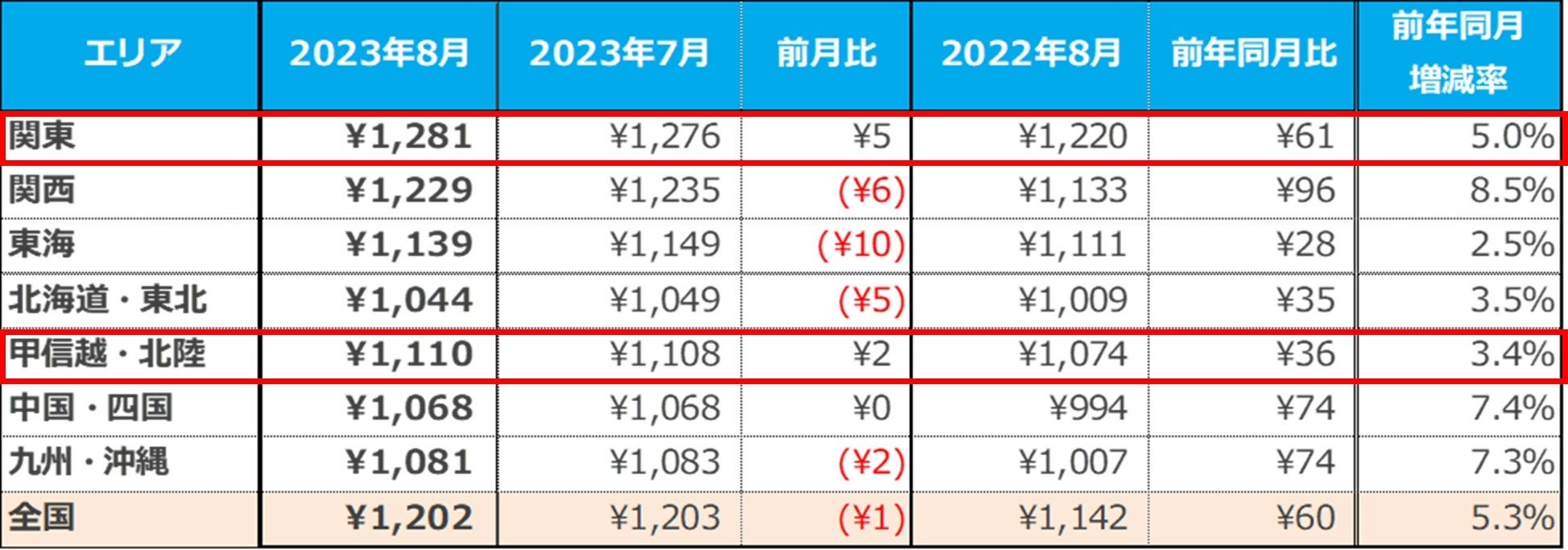 エリア別平均時給をみると、7エリア中「関東」「甲信越・北陸」の2エリアで前月比・前年同月比ともに増加となった。特に、「関東」は1,281円で前月比5円の増加、前年同月比61円の増加(増減率:+5.0%)となり、前年同月比は22年10月以降11カ月連続で増加、過去最高額も23年6月以降3カ月連続で更新している。【図4】