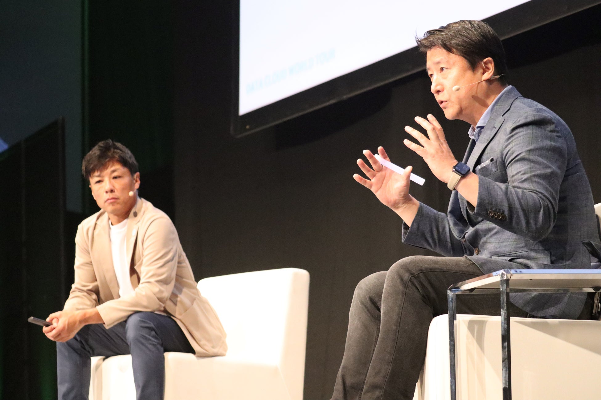 社長執行役員 東條 英俊とのエグゼクティブ対談では、NVIDIA 日本代表 兼 米国本社副社長 大崎 真孝氏、KDDI株式会社 執行役員常務 竹澤 浩氏がそれぞれ登壇しました。大崎氏は、6月に発表されたSnowflakeとNVIDIAの提携※について「技術者や研究者の方に生成AIをより簡単に使っていただき、スピード感のある開発が可能になるだろう」と構想を述べました。竹澤氏はグループ会社、関連会社を含む従業員5万人規模に対するSnowflakeを活用したデータコラボレーション構想について解説しました。