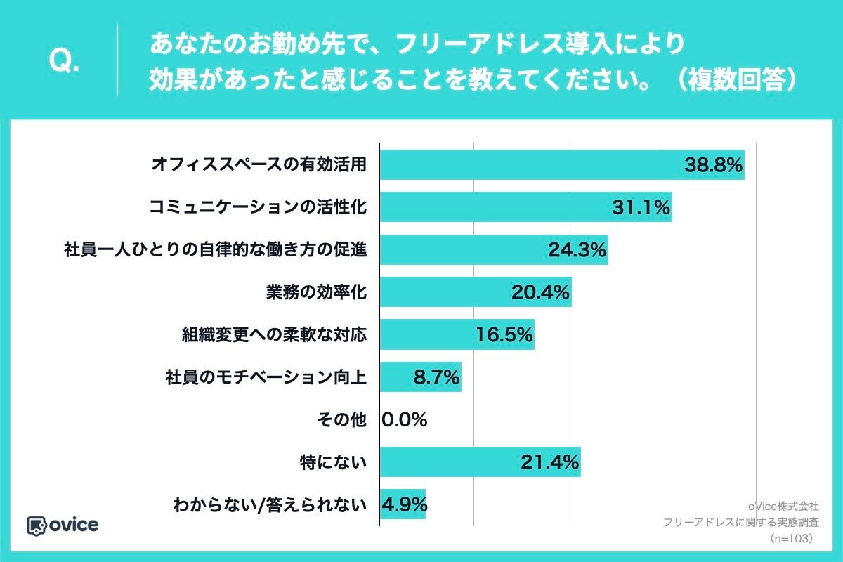 「Q.あなたのお勤め先で、フリーアドレス導入により効果があったと感じることを教えてください。(複数回答)」(n=103)と質問したところ、「オフィススペースの有効活用」が38.8%、「コミュニケーションの活性化」が31.1%、「社員一人ひとりの自律的な働き方の促進」が24.3%という回答となりました。各項目で4割に満たず、「コミュニケーションの活性化」を実感しているのは3割程度、効果が「特にない」と感じている社員が2割以上いることがわかりました。