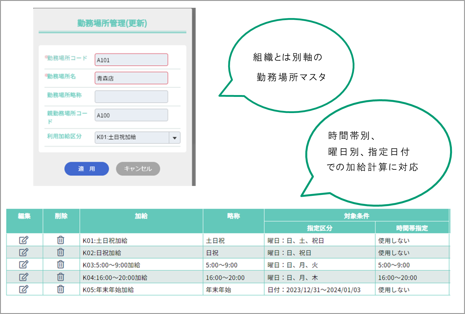 ・勤務実績入力で勤務場所(店舗)ごとの稼働実績を登録可能で、店舗間人件費配賦に対応します。
