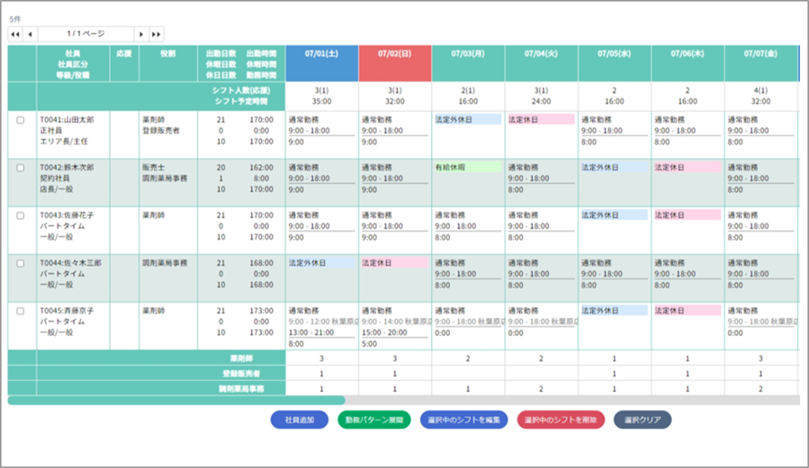 ・勤務場所(店舗)別で要員を一覧表示し、各役割人数を確認しながらシフト作成することができます。