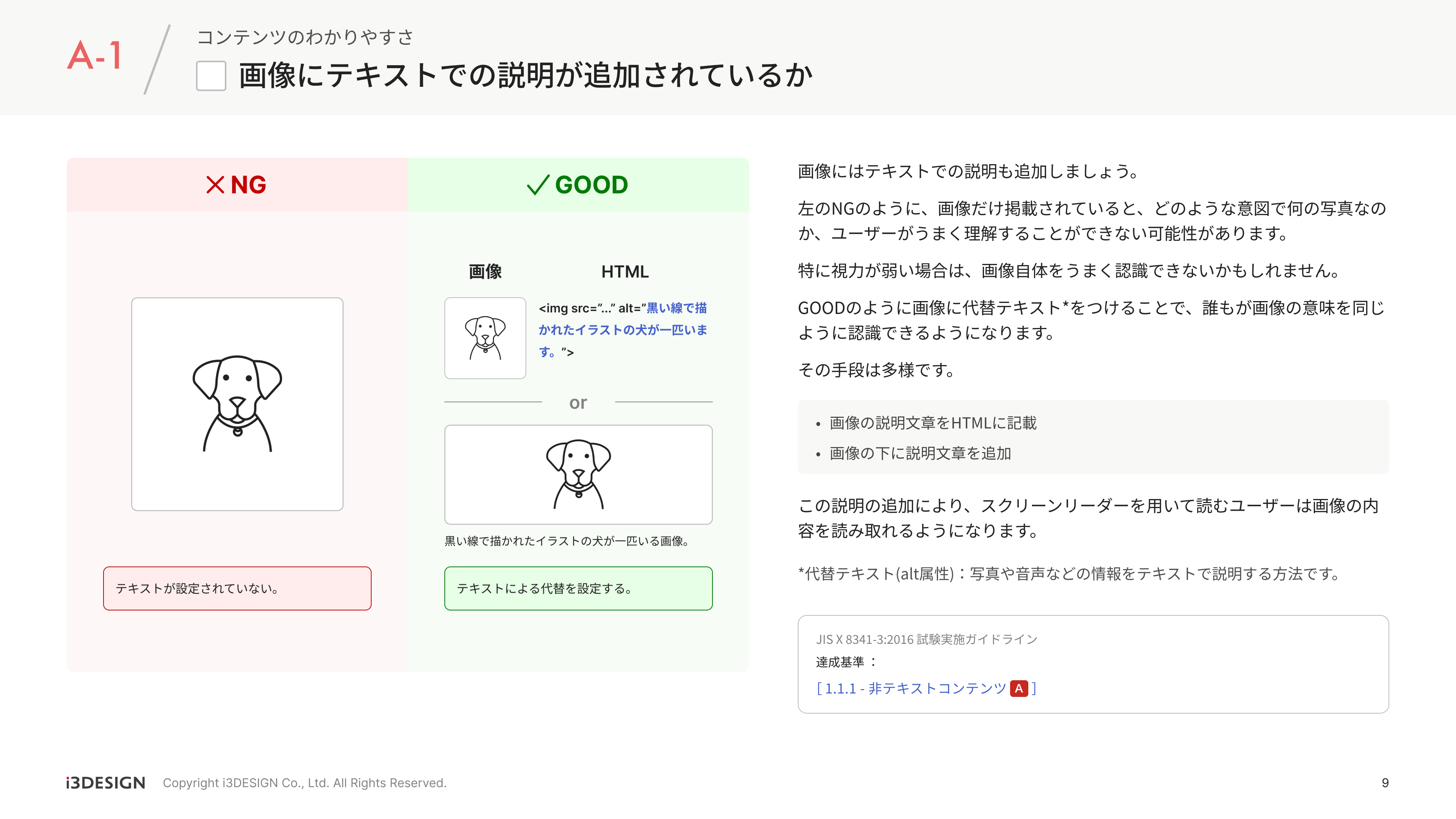 このJIS X 8341-3:2016は、初見では難しい内容となっている為、JIS X 8341-3:2016に基づき、私たちの解釈のもとやさしいテキストと図解を用意し本資料を作成させていただきました。