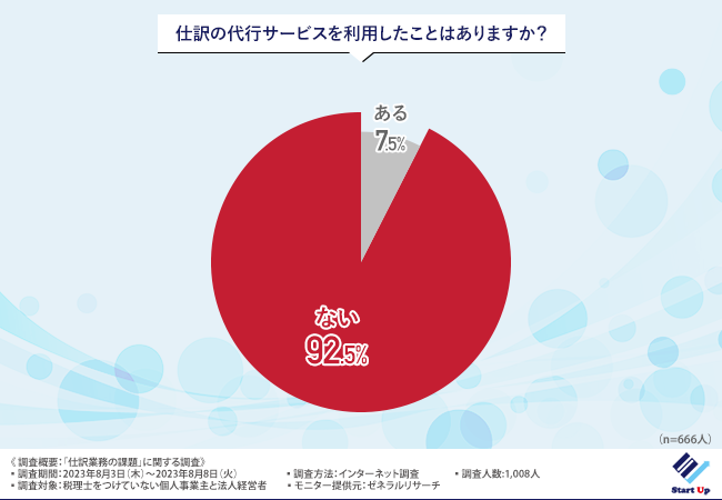 「仕訳の代行サービスを利用したことはありますか?」と質問したところ、9割以上の方が『ない(92.5%)』と回答しました。