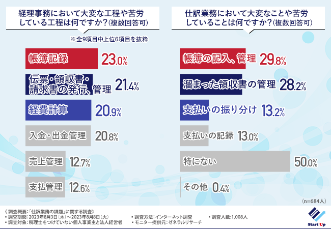 そこで今回、AIサポート機能『税金スッキリくん』を提供するスタートアップ税理士法人(https://tax-startup.com/)は、税理士をつけていない個人事業主と法人経営者を対象に、「仕訳業務の課題」に関する調査を実施しました。