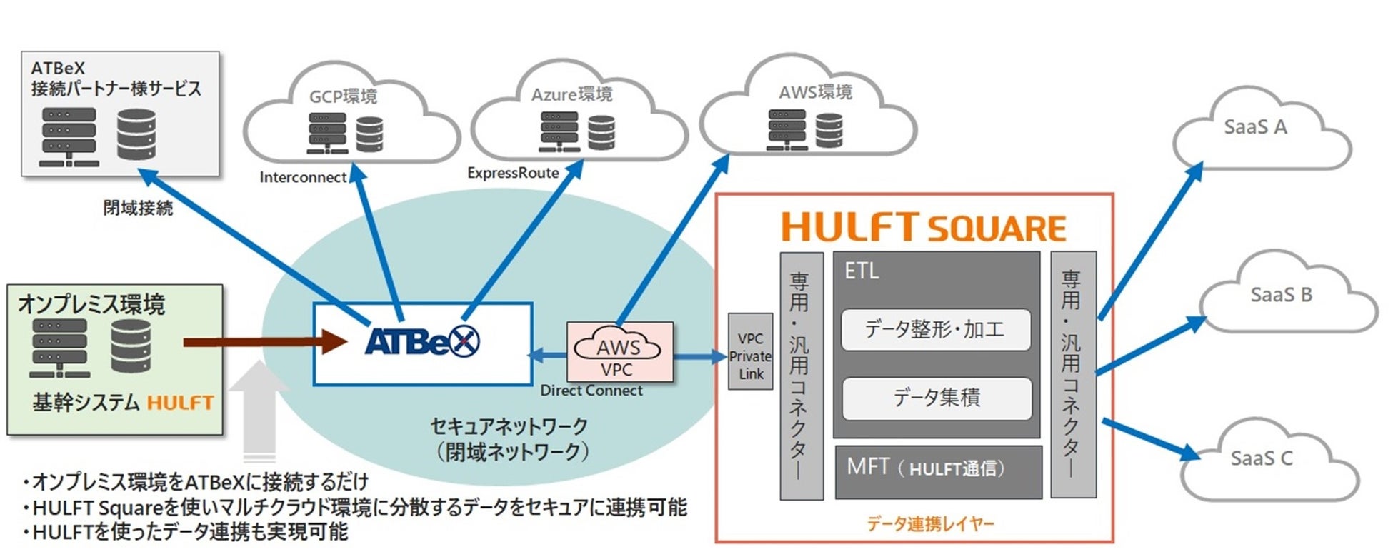 この連携サービスは、お客様のオンプレミス環境とマルチクラウド間のデータ連携ニーズに対しアット東京の「ATBeX」へ接続することで、「HULFT Square」を利用したセキュアなデータ連携をスピーディに実現します。これまで「ATBeX」を利用しAzureやGCPとの閉域接続をしていたお客様は、「ATBeX」からそのままAWS Direct Connect経由で「HULFT Square」へ接続できます。さらにHULFTを利用して、既存のオンプレミス環境にあるデータを「HULFT Square」に連携し、そのままクラウド側のシステムとの間でセキュアにデータを活用できます。