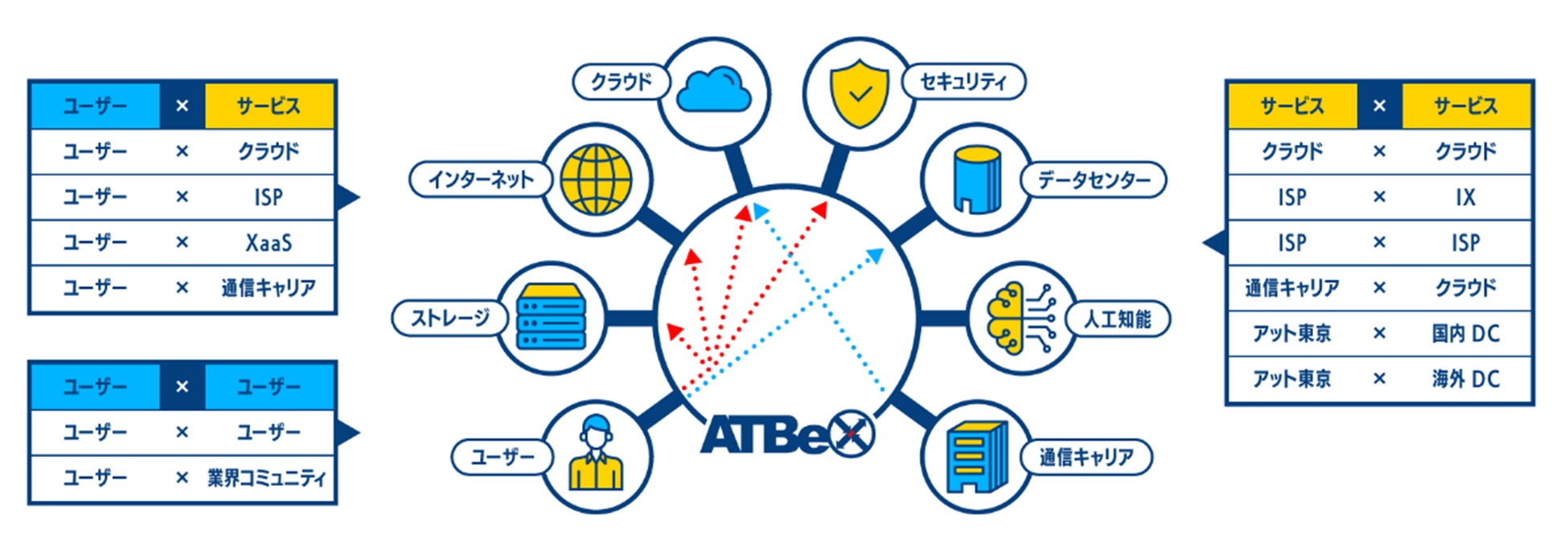 ATBeX(AT TOKYO Business eXchange、アットベックス)は、「つながる、広がる」を実現するネットワーク接続を提供します。メガクラウドをはじめ、さまざまなITサービス、データセンター間接続を、お客さまの要件に合わせてオンデマンドで利用することを可能にするネットワークプラットフォームサービス、それがATBeXです。