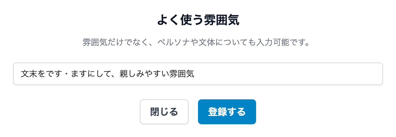 表示された画面のテキストボックスに、AIで文章を生成する際によく使う雰囲気やペルソナ、文体についての指示を入力し、[登録する]ボタンをクリックしてください。