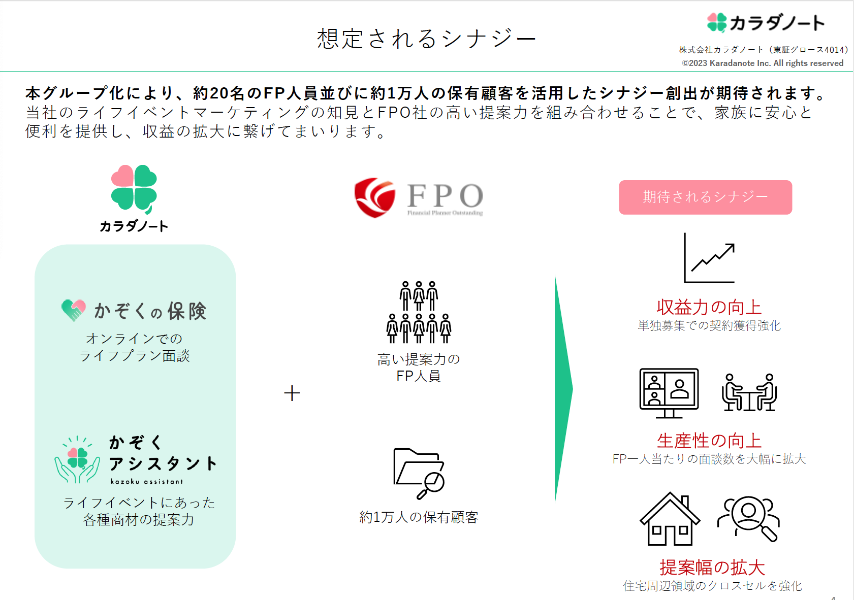 本グループ化により、約20名のFP人員並びに約1万人の保有顧客を活用したシナジー創出が期待されます。当社のライフイベントマーケティングの知見とFPO社の高い提案力を組み合わせることで、家族に安心と便利を提供してまいります。