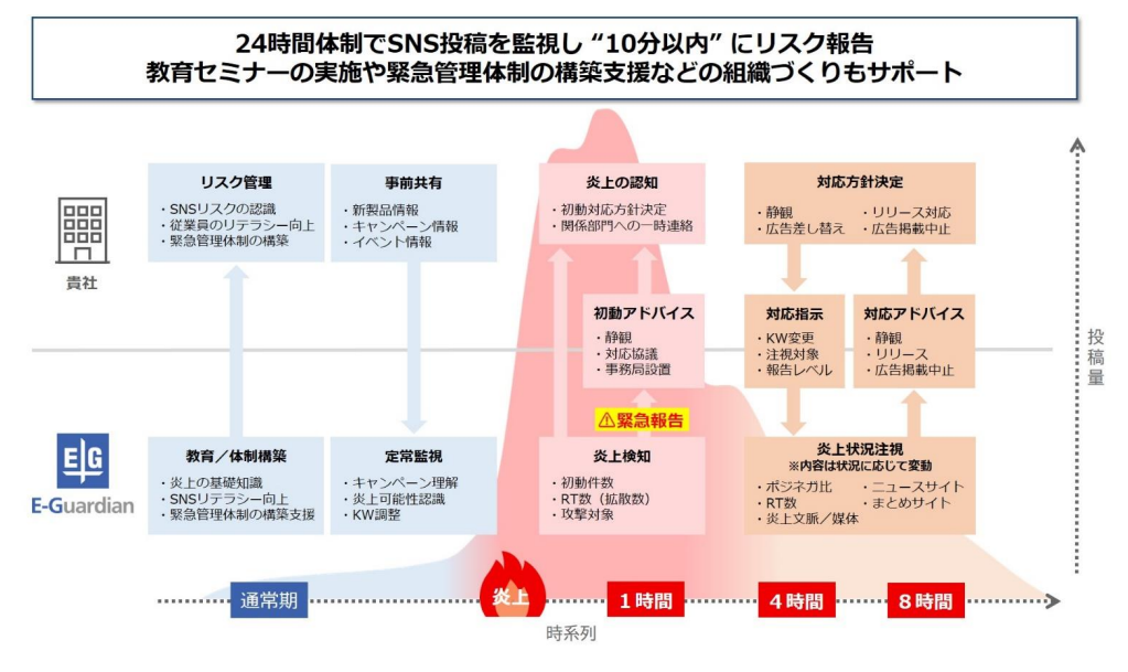 本サービスでは、定常的なSNS監視を24時間365日体制で実施し、炎上になりそうなリスク投稿を10分以内に一時報告、監視体制の強化や対応アドバイス、炎上対策で特に重要となる「最初の1時間・8時間」に向けたサポートなどを行います。SNSの他にも動画サイトのアップロード状況やコメントなども監視できるため、昨今問題になっているフェイクニュースなども幅広く検知可能です。