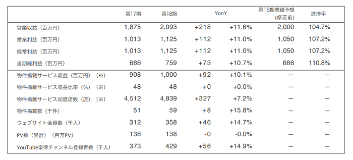 ・物件掲載サービスの収益、加盟店数が順調に増加。収益面では、過去に実施した値上げ(※後述)の効果が出始めています