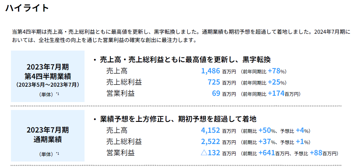 2024年7月期の業績予想は売上高5,200百万円(前期比+25%)、売上総利益2,800-3,000百万円(前期比+11-19%) 、営業利益150百万円(前期比+282百万円)を計画しており、通期黒字化を見込みます。なお、2023年11月に譲渡予定の不動産企画デザイン事業を調整すると、売上高の成長率は+35%、売上総利益の成長率は+15-23%です。