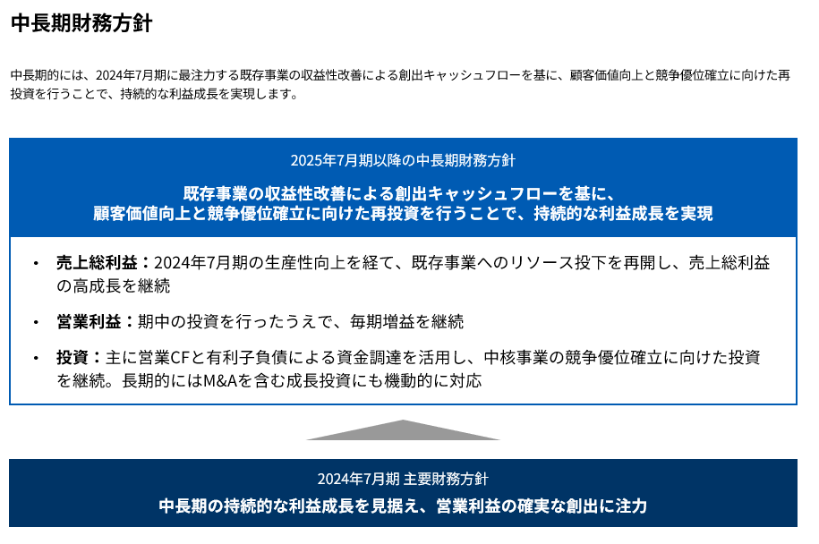 具体的には、全社における生産性向上を経て、既存事業へのリソース投下を再開し、2025年7月期以降は売上総利益の高成長を継続します。営業利益に関しては、期中の投資を行ったうえで、毎期増益を継続する方針です。投資の観点では、主に営業キャッシュフローと有利子負債による資金調達を活用し、中核事業への再投資を行います。長期的には、M&Aも含む成長領域への投資にも機動的に対応します。