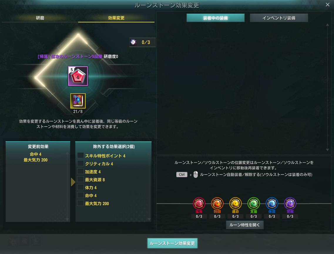 ルーンストーンのオプションを変更できる機能が追加されました。同一段階のルーンストーンまたは新アイテム「ルーンのエッセンスを込めた魔法書」を使用することで、オプション変更が可能となります。新アイテムを使用するとオプション変更時に不要なオプションを除外することができるため、以前より自分好みのオプションを狙いやすくなります。