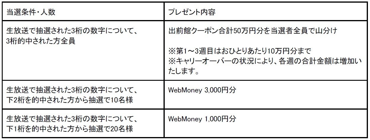 レベル20以上のキャラクターで『エリオン』にログインし、公式生放送で抽選される3桁の数字を予想いただくことでご参加いただけるキャンペーンとなっております。見事抽選された3桁の数字を的中させた方全員で、毎週合計50万円分の「出前館」クーポンを山分けいたします。