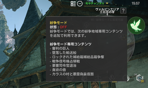 兼ねてより、ご要望の多かったフィールド上でのPVPが発生しないチャンネル「和平チャンネル」を実装いたしました。大拠点や村などで紛争モードのON/OFFを切り替えることが可能となり、紛争モードがOFF状態の 「和平チャンネル」では、相手陣営から攻撃されることがないため、安心してコンテンツを利用することが出来ます。