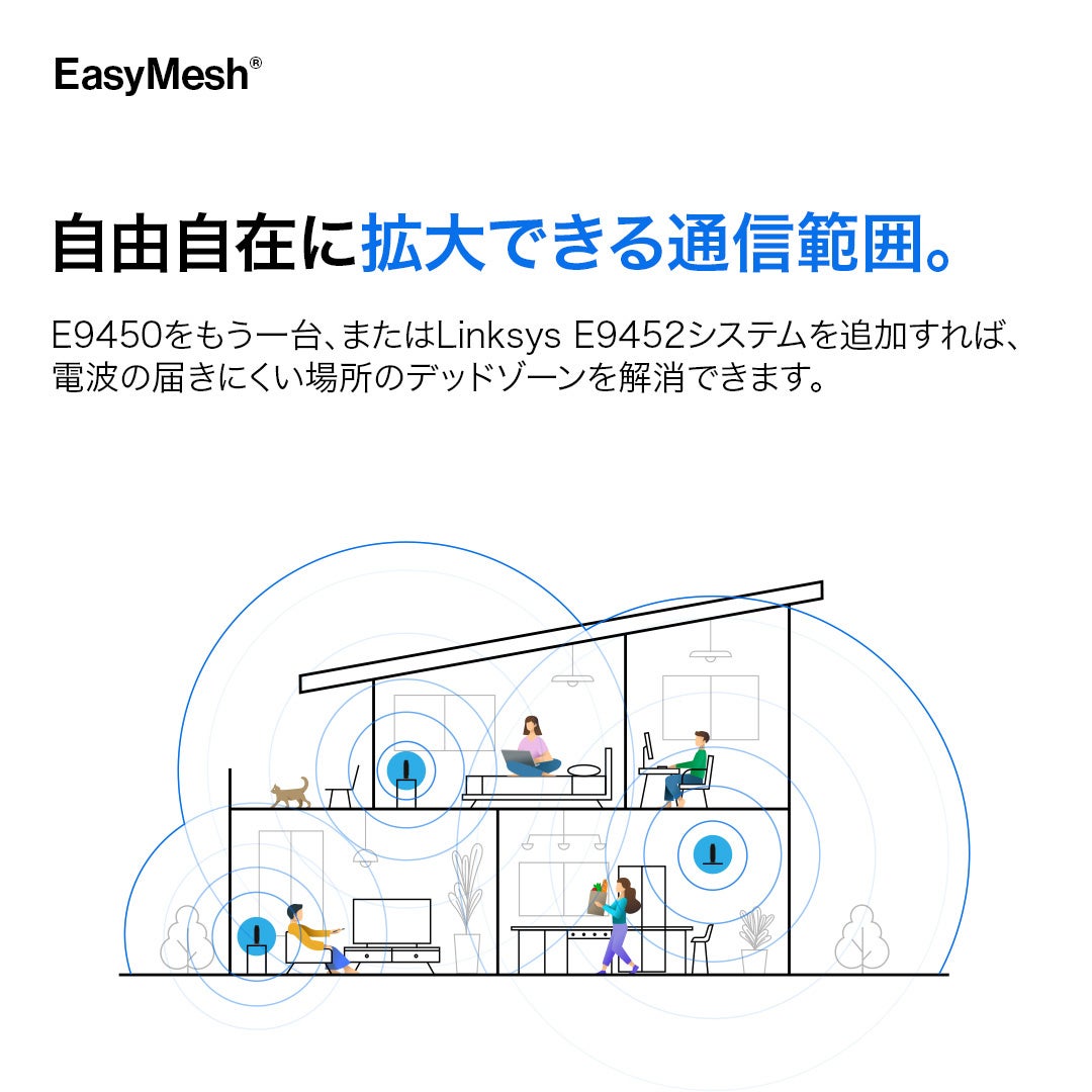 ご自宅の中に、WiFi電波が届かないデッドゾーンや、信号強度の弱い場所はありませんか。Linksys E9450 EasyMesh対応WiFi 6ルーターなら、そうした問題をただちに解決できます。EasyMesh対応とは、複数のE9450ルーターが相互に連携して、1つのメッシュWiFiネットワークを構築できることを意味します。ご自宅の隅々まで強力で安定した信号を届けることができるので、地下室から屋根裏まで、どこに移動しても接続が途切れません。もうデッドゾーンや電波の弱い場所に悩まされることはありません。ご自宅のあらゆる場所で安定したWiFi通信をお楽しみいただけます。※EasyMeshは業界共通規格ですので、他の機種・ブランドとの接続も可能ですが、メーカー保証は同機種のみです。